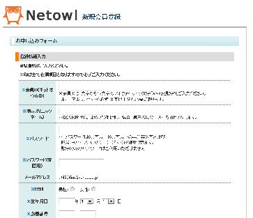 という上の「ネットオウルご登録フォーム」画面が出てきます。本当は上の画面の右側に私が入力した個人情報があるのですが、それは伏せさせていただいています。