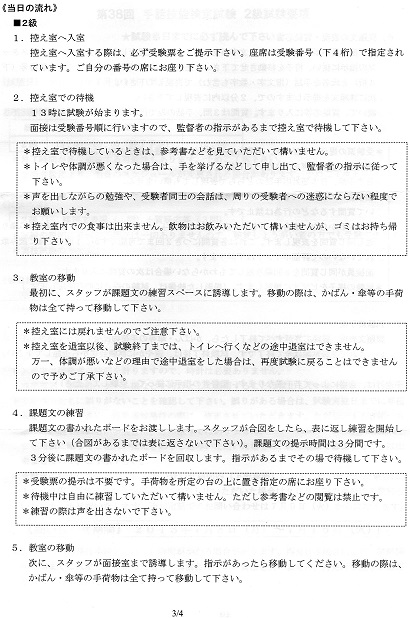 ※控え室を退室以後、試験終了までは、トイレへ行くなどの途中退室はできません。 万一、体調が悪いなどの理由で途中退室をした場合は、再度試験に戻ることはできませんので予めご了承下さい。